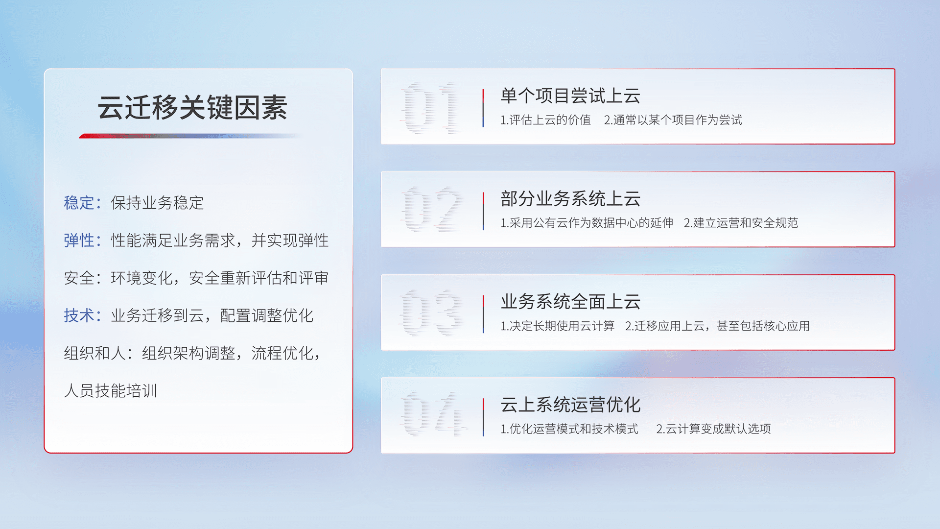 结合实际业务,,从规划设计、、云平台选型、、、、云原生改造、、、、数据迁移、、、集成交付,,,迁移全过程为客户识别最佳上云路径,,做好风险识别管理,,设计网络架构、、、身份权限、、、安全审计合规、、、操作审计、、日志审计、、、监控告警策略、、、、多站点容灾设计等,,对云上基础设施进行整体规划,,提升IT治理水平,,,,以满足弹性、、、、高可用、、高性能的需求。。