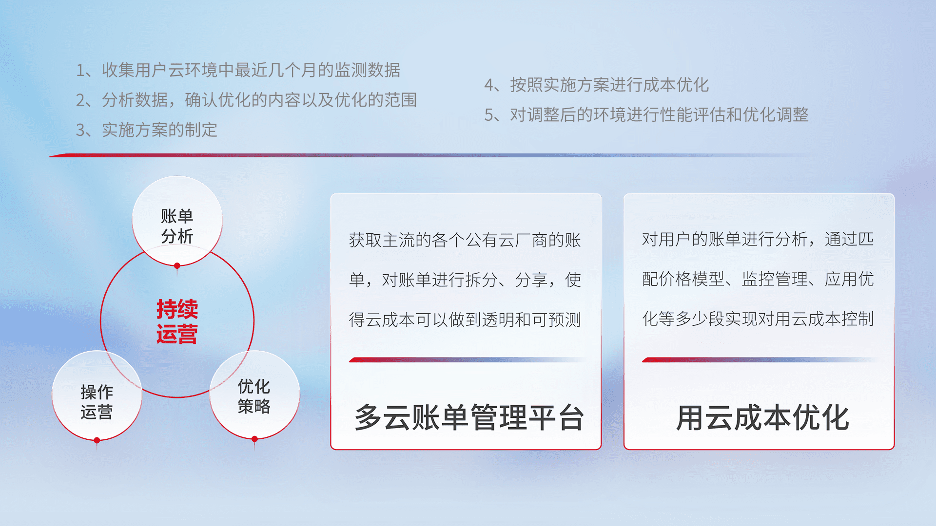 通过多云纳管,,,,以统一的资源数据模型把客户的云资源进行抽象和封装,,,,进而实现对多云资源的统一操作,,保障云资源管理的可靠性、、、、稳定性与可用性。。。量身定制化运维内容,,,配置、、、、开发运维、、、、补丁管理、、备份、、、、监控、、、、认证和访问管理、、、、审计和日常巡检等,,,,保障在用云过程中的可靠度,,,,稳定度以及高可用率。。